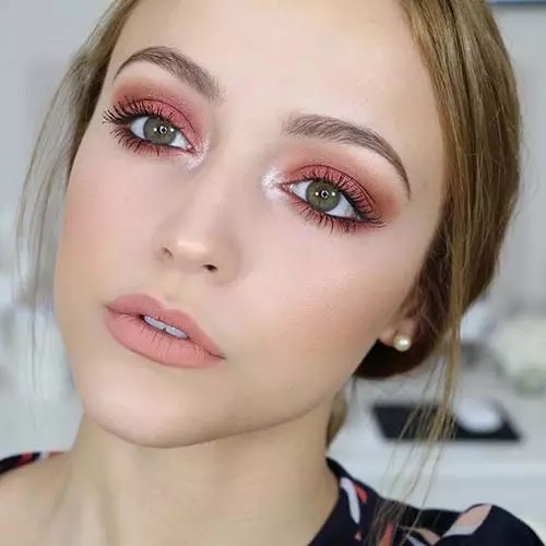 رنگ گرم سایه همچون نارنجی هم برای آرایش با لنز سبز گزینه جذابی است. این دو رنگ مکمل هم هستند و در کنار هم زیبایی دلنشینی ایجاد می‌کنند.